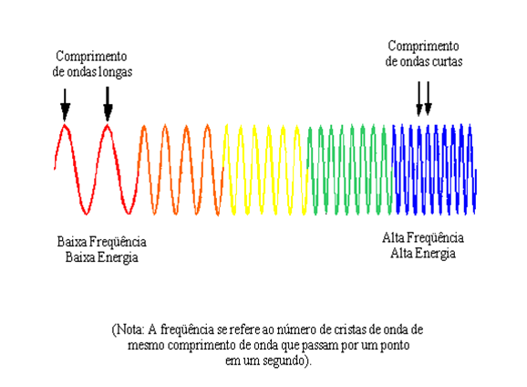 Por exemplo, a luz vermelha tem uma determinada frequência de vibração, a onda azul tem outra, e assim por diante, cada cor tem sua frequência específica. No caso da luz visível a luz vermelha é a que tem a menor freqüência de vibração, e a luz azul (violeta) a maior (por isso estas suas cores são as duas extremidades do arco-iris).